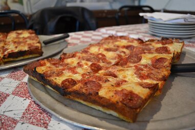 This pizza is cut into squares.