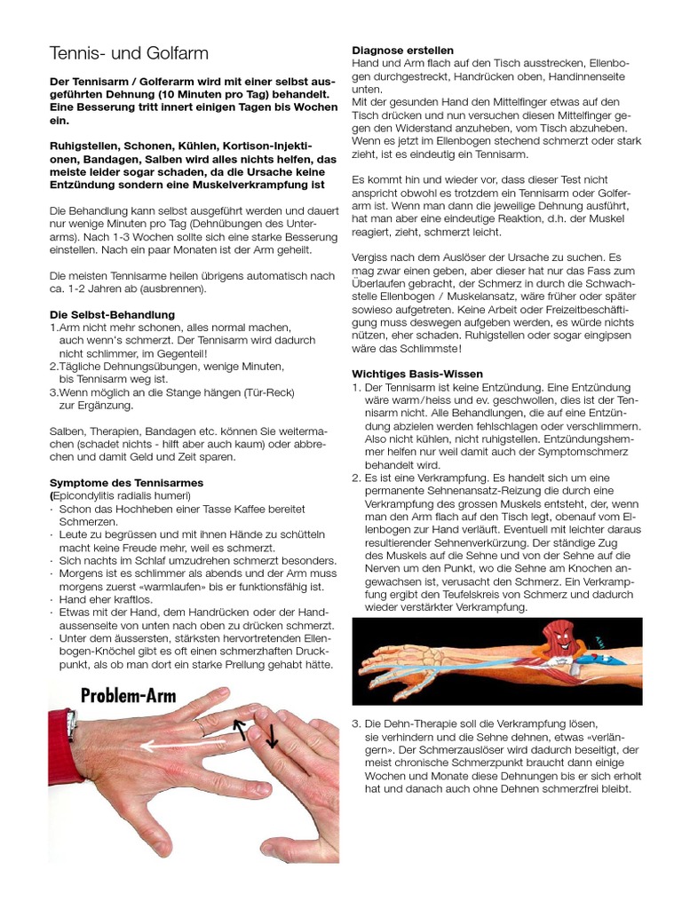 Der Tennisarm Golferarm wird mit einer selbst ausgefÃŒhrten Dehnung 10 Minuten pro Tag behandelt. Gegen Tennisarm-Beschwerden ist die sogenannte exzentrische Trainingstherapie am besten untersucht. Eine ziemlich häufige Sportverletzung.