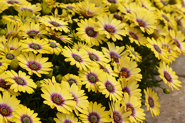 Plant in full sunpart shade in well drained soil. Sunny yellow flowers with a blue-violet center are prolific over a long blooming season from spring to fall. A bushy South African Cape Daisy it will cover itself in flowers from June to September.