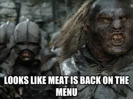Looks like meats back on the menu boys. Make LOTR Meat back on the menu memes or upload your own images to make custom memes.