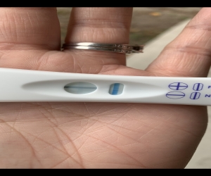 Equate pregnancy test line wrong direction. It came up with a darkish line almost immeadiately but it was going across the window rather than top to bottom. Just a drop of urine in it and bang. Okay so Ive had sore boobs ever since when I was supposed to ovulate they are also swollen and gone up about 2 sizes and Ive had on and off period type.